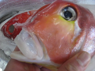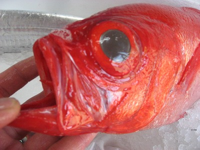 きんめ。 皮目を炙って刺身。 煮付け、塩焼き、蒸し、、、 何にしても旨い。 1キロ~2キロの間が好みですね。 ガバっと口開いてみました! 今日のはかなりいい感じに脂ノッてます!!