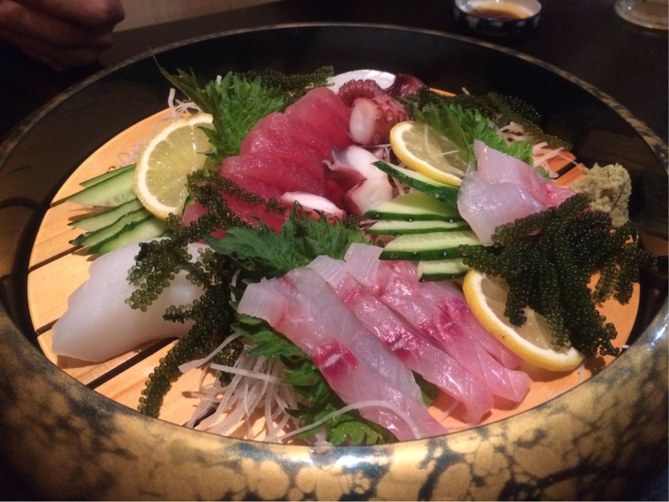 沖縄初日夜メシ、北谷の海沿いに降りて、地元の寿司屋へ。島の魚の刺身盛りでビール、泡盛。なかなか刺身旨し。