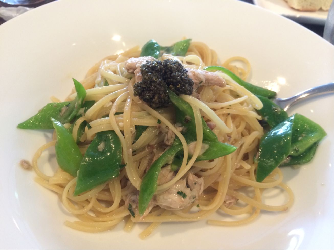 秋刀魚と万願寺のパスタ、秋刀魚を燻製するか何か、もう一つコクが欲しいトコロですなーー