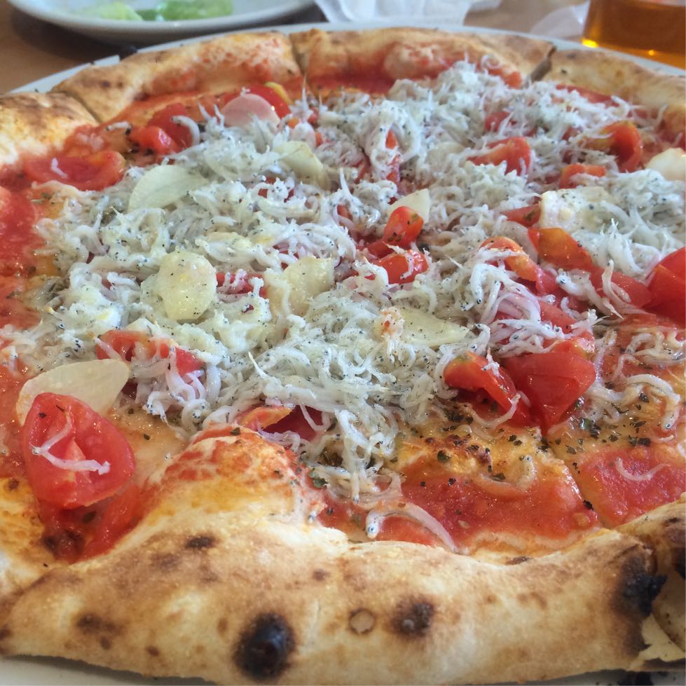 しらすとニンニク、トマトソースのピザ。これはビールが進みますわ〜!