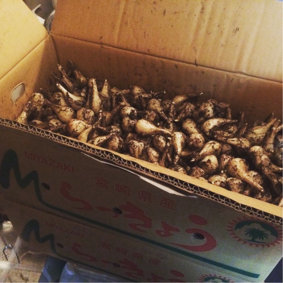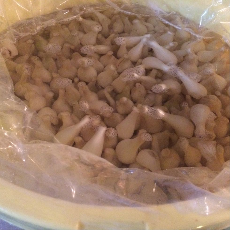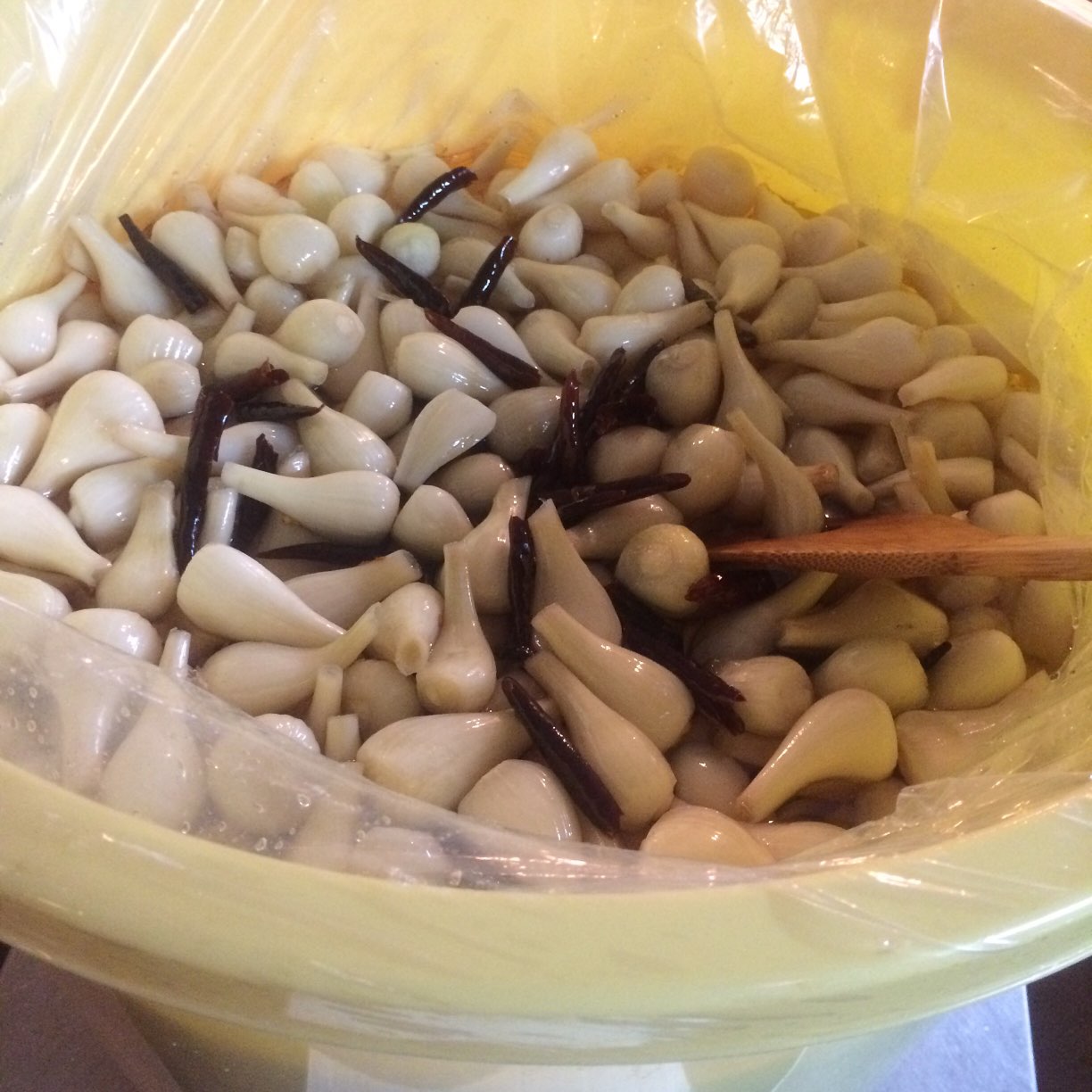 根っこと先を切って、皮一枚剥いて泥を洗い流し、塩水漬けした後、甘酢に漬けます。たいした作業行程ではないのですが、量が多いのでそれなりに大変な作業です!