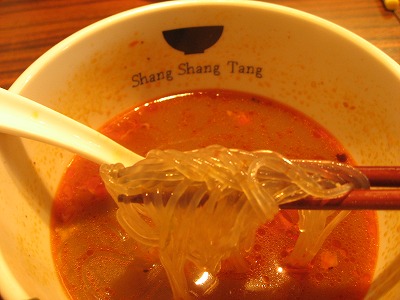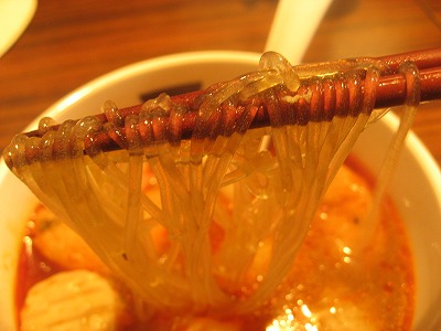 春雨の麺と辛くてスパイスの効いた激ウマのスープです。