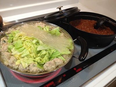 鶏つくね、春キャベツ、春雨の鍋。キーマカレー。